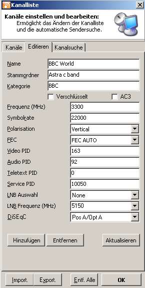 Tjod Posted January 9, 2006 Posted January 9, 2006 (edited) Ich weis leider nicht genau ob diese anlage mehrere oder nur einen Sateliten anpeilt aber bei kanalsuche findet er den VIVA Polska über den Stamordner "Astra 1B,1C,1E,1F,1G,1H,2C" Wie viele LNB´s hast du? Du kannst maximal einen Satelliten pro LNB empfangen, sofern deine Schüssel nicht mit einem Motor ausgestattet ist. ma davon ab hinter welchem dieser vielen astra dinger verbirgt sich den der Astra 19° E die dort gegebenen tragen diesen namen alle nicht "Astra 1B,1C,1E,1F,1G,1H,2C" Stehen alle in Astra 19 East das heißt mit beiden bezeichnen ist dasselbe gemeint. Nun bin ich zuhause und hier ist soweit ich weis ne Digitale anlage.. Wie viele Kabel kommen vom LNB? Sind noch andere Empfangsgeräte an der Satanlage angeschlossen? Wenn ja was Empfangen die. Importier mal diese Kanalliste Wenn das nichts hilft, mach mal einen kompletten Suchlauf auf Astra 19° E und exportiere das Ergebnis und füg es als Anhang an deinen nächsten Post an. Edit: Wenn du nur ein LNB hast bist du bei DiSEqC meistens mit "None" am besten bedient. Edited January 9, 2006 by Tjod Quote