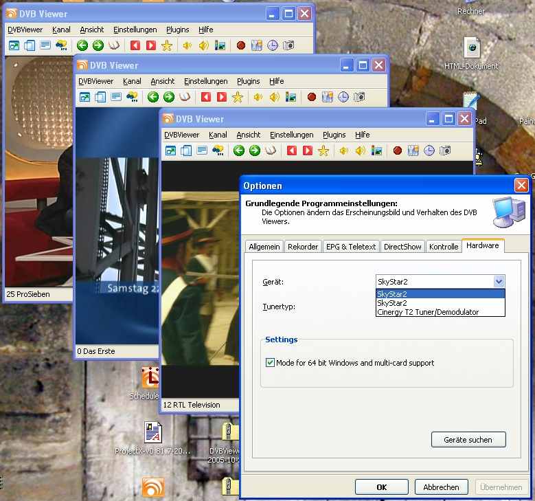 Griga Posted January 16, 2006 Posted January 16, 2006 Also ein USB/PCI-Gemisch mit TechniSat-Geräten scheint mit dem Beta-Treiber einigermaßen zu laufen, wie zu hören war. Vor einiger Zeit hatte ich schon mal Tests mit zwei PCI-SkyStar2 durchgeführt, und es ist tatsächlich geglückt, beide gleichzeitig in zwei GE-Instanzen zu benutzen (die Multituner-Version gab es zu dem Zeitpunkt noch nicht). Allerdings habe ich es nach ein paar sehr harten Abstürzen wieder aufgegeben, insbesondere, als Windows nicht mehr starten wollte - nur noch mit der zuletzt funktionierenden Konfiguration. Demnächst werden erneute Versuche unternommen... Unten ein Schnappschuss von dem zeitweiligen Erfolg: Zwei SkyStar2 PCI plus Cinergy T2 (DVB-T) als Trio: Quote