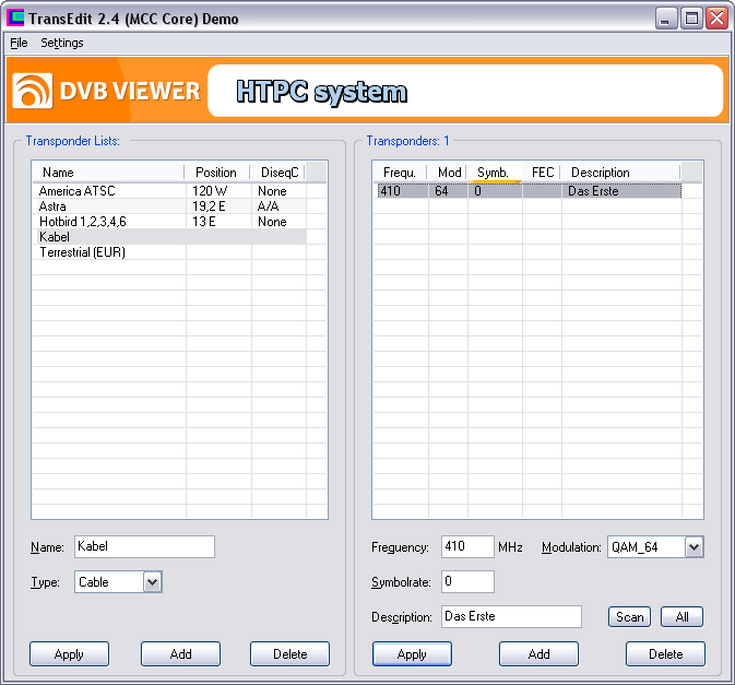 matthiasw Posted February 4, 2006 Author Posted February 4, 2006 (edited) Upps wenn man wieder nicht richtig liest wähle links unten Cable aus, dann erscheint oben ein neuer Eintrag mit New. Auf der rechten Seite gebe im unteren Bereich einen dir bekannten Sender (Freqenz, Symbolrate, Modulation) ein, und drücke auf Add. <{POST_SNAPBACK}> Wenn ich das tue (siehe Screenshot) dann passiert bei einem Doppelklick auf diesen Eintrag garnichts. Die Symbolrate hatte ich auch eingetragen, nuir beim Screenshot erstellen vergessen. So langsam verzweifle ich noch daran aber ich will halt nicht 15€ in den Wind schießen. Edited February 4, 2006 by matthiasw Quote