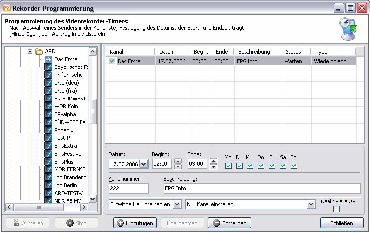 gema Posted July 12, 2006 Posted July 12, 2006 DVBViewer 3.5.0.1: programmiere Timer mit Datum, Beginn, Ende eine Stunde später, "Erzwinge Ruhemodus", "Nur Kanal einstellen" und kein Haken an "deaktiviere AV" -> DVBViewer startet zur angegebenen Zeit, geht aber zur Ende-Zeit nicht in den Ruhemodus. Quote