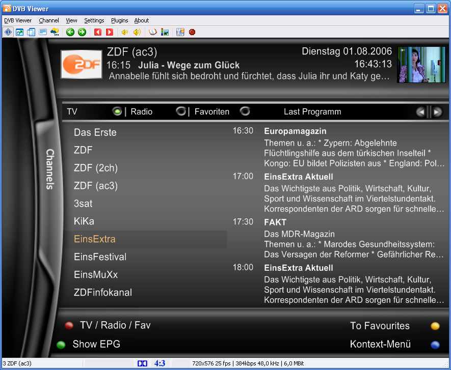 Griga Posted August 1, 2006 Posted August 1, 2006 "An *ouch* Overlay is not working, try an other way" is inside, Doesn't work here with two DVBViewer instances. I launch GE with overlay, then Pro -> no picture. The other way round: GE falls back to "Unchanged" (VMR 7 surface in windowed mode). Did I miss something? P.S. Indeed, I did. It works, if the OSD is disabled. The OSD seems to cover the whole TV picture with a bitmap (overlay color, I guess, non-transparent in the fallback mode). Ok, I admit it's difficult to handle with this kind of OSD, in contrast to the GE's "patchwork" OSD. Particularly because the DirectShow GraphBuilder can't be convinced to use a "VMR 7/9 windowless mode" fallback automatically (which would work with enabled OSD). but there is no "jesus, it worked till now and after starting psp/corel it breaks, so do something" is not implemented. That's not the reported issue, as I understand it: * Start DVBViewer in overlay mode * Start PSPX 10.03 ... still works. Quote