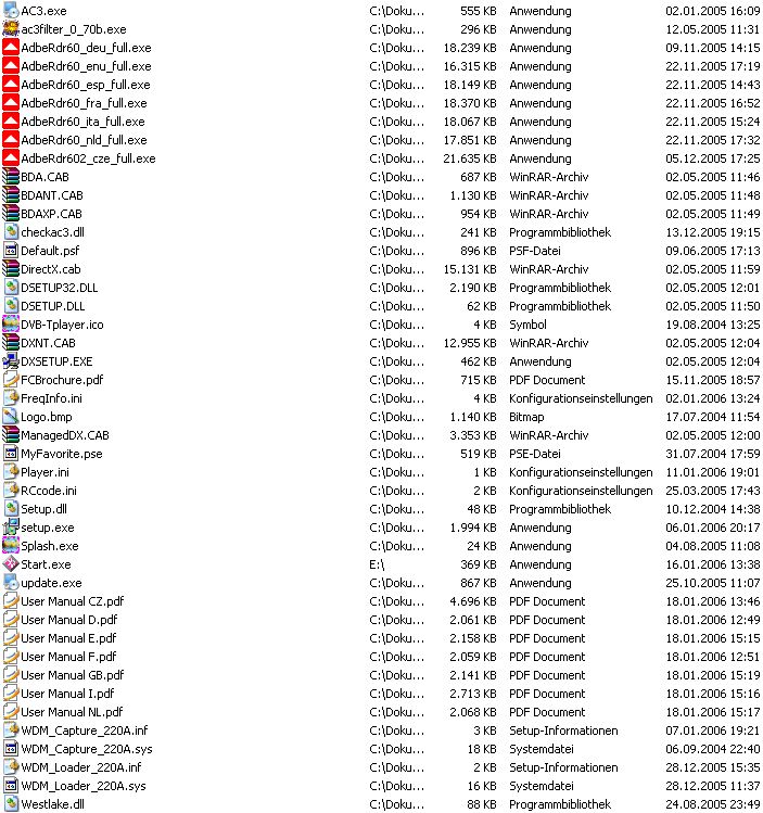 hanns Posted August 19, 2006 Author Posted August 19, 2006 Hast Du die Software komplett installiert oder versucht irgendwelche Treiber einzeln zu installieren ? Könntest Du mal das Inhaltsverzeichnis deiner Freecom-CD (mit Dateigrößen und Dateidatum) posten. Mich würde interessieren, ob die mit meiner identisch ist. Hallo! Ich hatte eigentlich die gesamte CD installiert. 3 Mal kam auch der Hardwareassi und hat was installiert. Kann aber sein, ich weiß es nicht mehr genau, dass ich danach nochmal ein zwei Sachen wieder gelöscht/deinstalliert habe, nachdem ich dachte, ich wüßte, was ich brauche. Zudem habe ich ein paar andere Player ausprobiert, die aber alle nicht so gut waren. Anbei ein Screenshot der Inhalt der CD. Der jetzige Treiber läuft, und daher: never change a running system! Danke! Hanns Quote