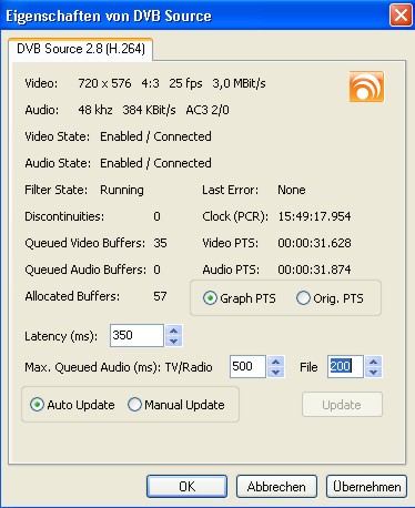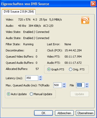 wbeinh Posted September 15, 2006 Author Posted September 15, 2006 @Tjod Daran habe ich auch schon gedacht. Ich habe aber keine Ahnung, wie ich bei meiner Twinhan Mantis 2033 an den Stream herankommen soll (müsste sowas wie DVBSource sein). Vielleicht weißt Du es??? @Engelbert Ich habe wieder mit dem Provider gesprochen. Er hat bei einem Receiver nachgesehen und der hat sich bei RTL bei 506,018Mhz ge"lock"ed. Ich habe diese Frequenz versucht, dann lief das Ding 11 Minuten (siehe DVBSource Screenshot. (Das kann aber auch Zufall sein, weil es lief schon ein paar Mal länger als 3 Minuten.) @Griga Die Tests: 1a) Aufnahme nach Freeze DVBViewer lebt noch und tut auch so als würde er aufnehmen. Das Ergebnis ist aber eine 4byte große mpg Datei. Wahrscheinlich uninteressant: Wenn man diese abzuspielen versucht, kommt "Kann Video nicht rendern 0X80040265. 1b) Aufnahme mit Scheduler DVBViewer im Standby-Mod (-c) gestartet. 60 Minuten lange Aufnahme von RTL Program programmiert und zur Sicherheit auch im Scheduler "Deaktiviere A/V) angehakt. Die resultierende mpg Datei habe ich mir vollständig angesehen: Programm war voller Schwachsinn, aber technisch einwandfrei. 2) Screenshots der Zustände liegen bei. Bei der Version "DVBViewer DVBSource after Freeze.jpg" stehen die Zeitinformationen (PCR / PTS) still!! 3) In TransEdit wird Audio anders behandelt. Es hört sich ein wenig anders an und der Pegel liegt zumindest 20dB über der Ausgabe vom DVBViewer. Kann das der Grund sein? Was kann ich diesbezüglich versuchen? 4) DVBViewer GE werde ich installieren, falls Du mit diesen Tests keine Rückschlüsse auf die Probleme ableiten kannst. Muchos Gracias Quote