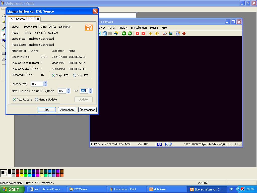Derrick Posted October 16, 2006 Posted October 16, 2006 @snoopyab, du hängst dich hier als trittbrettfahrer rein, hast aber vielleicht ganz andere probleme. Eine mappe einfach kopieren geht nicht oder hast du eine identische konfiguration und die gleichen directshow filter in deinem system? Mach bitte einen eigenen thread auf und füg als erstes bitte einen support.zip an. Unter Ansicht\ Filter\ Cyberlink h264/AVC Decoder (PDVD7) hab ich nicht die Option, die Hardwareunterstützung zu aktivieren.... ..auch wenn das möglich wäre, wäre es mehr als zweifelhaft, ob das bei h.264/avc irgendeinen spürbaren effekt hätte Dein problem würde das auch nicht lösen können. Du musst deine aussenanlage und satzf-verteilung auf vordermann bringen. Sonst geht gar nichts. Hier mal ein beispiel von einem zu schwachen rechner aber mit gutem empfang. Da sind keine discontinuities zu sehen Quote