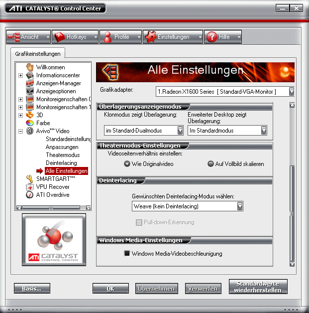 mk.keck Posted September 20, 2006 Author Posted September 20, 2006 Man kann den Decoder-Eintägen leider nicht ansehen, um welche Versionen es sich handelt. Ältere reichen vielfach nicht mehr aus. Derzeit empfiehlt sich als Video-Decoder der von Cyberlink (PowerDVD 6 oder 7, Trial genügt), als Audi-Decoder der Ac3Filter ... Danke für die schnelle Antwort ... - den Cyberlink DVD Video-Decoder (Power DVD 6) habe ich (war ber der GraKa mit dabei) - den neuen AC3 habe ich auch (K-Lite Codec Pack) Nun für alle die auch die selben Probleme mit der ATI X1600 Pro haben sollte: Ich habe bestimmt nun einige Stunden rumprobiert ... 1. bei ATI den neuen Bildschirmtreiber (z.Z. 6.8) downloaden und installieren 2. bei ATI das neue Catalyst CC (z.Z. 6.8) downloaden und installieren 3. bei ATI das neue AVIVO Paket (z.Z. 6.8) downloaden und installieren 4. Einstellungen im Catalyst wie folgt vornehmen: 4.a. CCC mit "Erweiterten Einstellungen" starten 4.b. in Grafikeinstellungen AVIVO-Video auswählen 4.c. dort dann auf "Alle Einstellungen" 4.d. unter Deinterlacing "Weave (kein Deinterlacing)" auswählen 4.e. Windows Media-Videbeschleunigung deaktivieren (siehe Datei-Anhang) Somit läuft es - wenn noch nicht perfekt - aber annähernd besser. Gruß Michael Quote