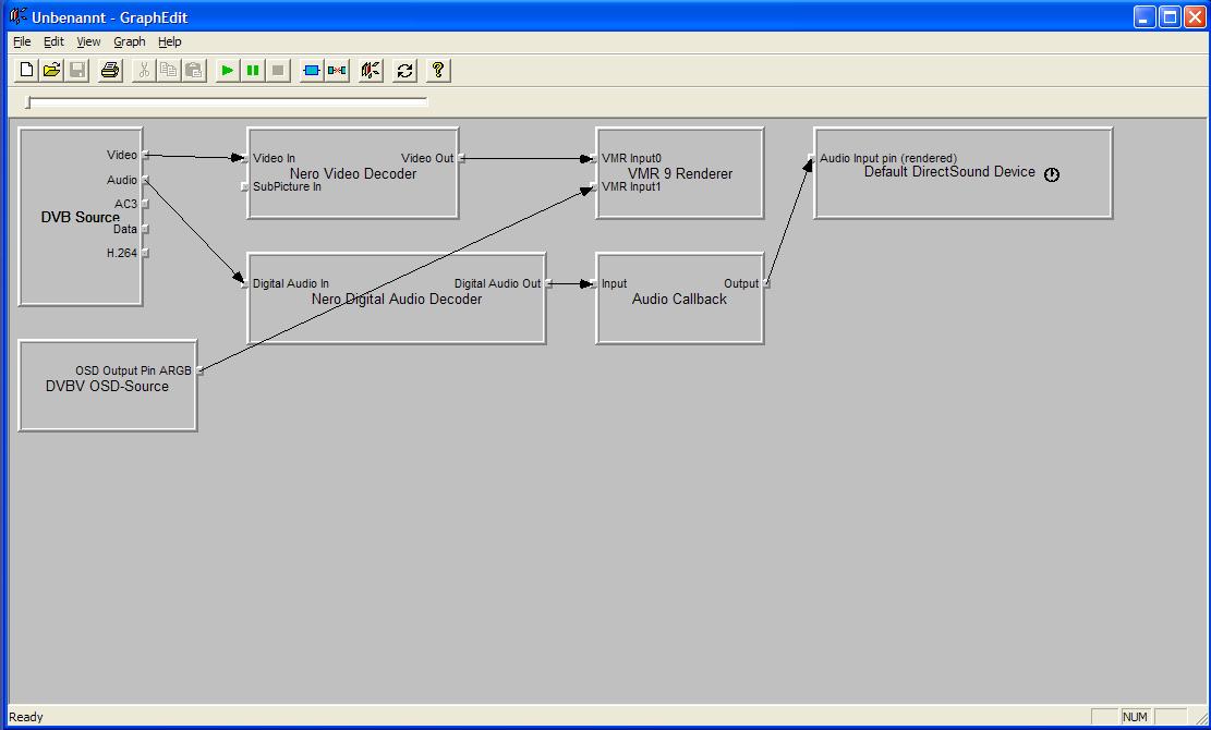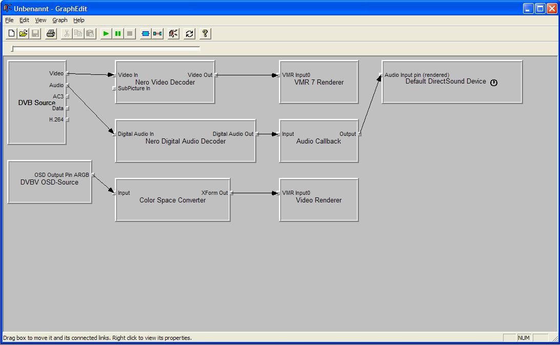 amansi68 Posted October 19, 2006 Author Posted October 19, 2006 Hallo, ich habe drei Dateien mit Graphedit erstellt und angehängt: vieleicht kannst du daran was erkennen. Übrigens habe ich entdeckt das wenn man in Graphedit in der Iconleiste auf die grüne Play Taste klickt geht das ActiveMovie Window Fenster auf bei VRM7. Quote