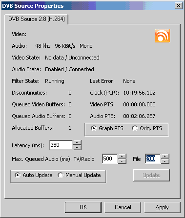 beermonster49 Posted October 31, 2006 Author Posted October 31, 2006 Which means they are simply not played on your PC, at least not "live", right? Does DVBViewer play the recorded mp2 files flawlessly? After having tuned such a station, please open the property page of the DVBViewer Filter (View -> Filters -> DVBSource) and check what it reports, particularly the audio state and audio format. Post it here or attach a screenshot. I've just had another play. Attached are a couple of files. The radio stations with no sound that do not play 'live' on this pc, record ok in mp2 and the recordings play ok via DVBViewer and wmplayer. However, I had a look to see what audio codecs are available in DVBViewer. The audio was using a codec called 'MPA Decoder Filter'. This was the first in the drop down list which is why it was used. Using this codec most radio stations play 'live', but some (r5 live, r5live sports, bbc world service and oneworld) don't. With the codec changed to 'MPEG Audio Decoder' the sound is stuttered like an old fashioned medium wave at night but at a faster speed, while on Descaler Audio Decoder, or Arcsoft MPEG Audio Decoder all the radio stations playOK. Later - I've found a 'TV/Radio Preformat Detection' option. When the audio is checked those 4 radio stations now play ok on all codecs. For info attached are 2 screenshots from when using the 'MPA Decoder filter', before checking the 'Radio preformat detection'. Cheers. Graham. Quote