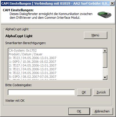 sisul83 Posted April 25, 2007 Posted April 25, 2007 (edited) Leider kann man ja bei den aktuelleren Alphacrypt-Versionen den Jugendschutz nicht mehr deaktivieren.sagt wer? Ich hab auch die aktuelle Soft drauf und der JS ist und bleibt aus! Ansonsten kann man doch im Alphacrypt-Modul die Meldungen ein- oder ausstellen. DVBViewer -> Ansicht Zeige CAM. Dann im Alphacrypt-Modul-Menü unter Einstellungen bei SmartCard-Meldungen eine gewisse Zeit einstellen (ich hab da 10Sekunden eingestellt). Meldungen wie "Keine SmartCard gesteckt" zeigt mir mein AC allerdings nie an, weder am PC, noch im Receiver. Ich glaub sowas kann das Modul von Haus aus nicht, weil man eigentlich vorher weiß ob man eine SmartCard gesteckt hat oder nicht. Ich hab da auch mal ne Frage. Im Alphacrypt-Menü kann man sich ja die Berechtigungen auf der SmartCard ansehen. Leider kann ich in dem sich öffnenden Fenster nicht scrollen. (siehe Anlage/hochgeladene Datei) Ist nicht weiter schlimm, es täte mich nur interessieren an was das liegt. Ich vermute fast am BDA-Treiber der TV-Karte (Happauge-Nova-CI) Edited April 25, 2007 by sisul83 Quote