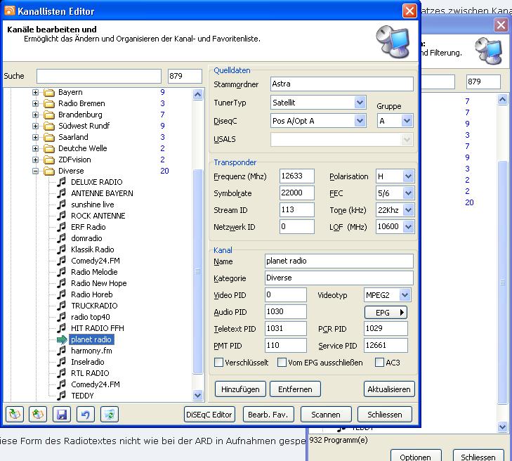 adrian84 Posted February 12, 2007 Author Posted February 12, 2007 Habs leider immer noch nicht hinbekommen. Das Scannen brachte kein brauchbares Ergebniss und auch mit den anderen Einstellungen habe ich es bislang nicht hinbekommen. Würde dem ganzen vermutlich auch nciht so intensiv nachgehen, wenn ich nicht Planetradio bei meinem Sat Receiver (an der selben SAT Schüssel angeschlossen) problemlos empfangen könnte... Gibt es für euch vielleicht irgendwie die Möglichkeit nen Screenshot zu machen vom Kanal Listen Editor mit den exakten Einstellungen mit denen ihr Planet Radio empfangt. Hoffe das mir dies helfen würde. Hab mal nen Screenshot mit meinen Einstellungen angehängt. Wäre super wenn jemand helfen kann. Lg Adrian Quote
