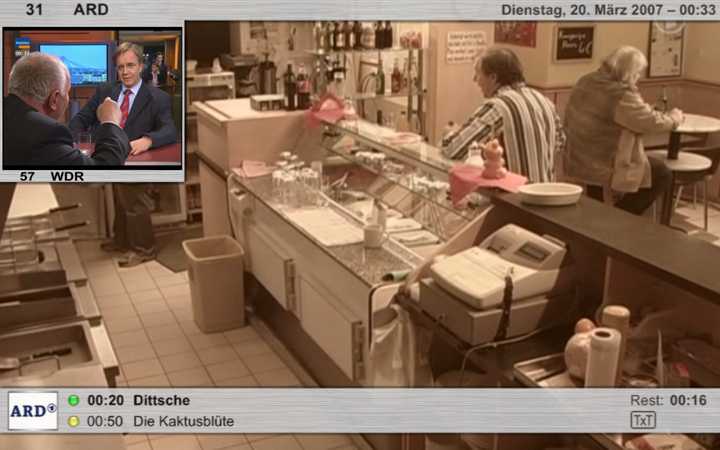 NeDrY Posted March 20, 2007 Posted March 20, 2007 (edited) So Lars, habe mir jetzt mal ein paar ausgiebige Gedanken zur Multi-Tuner-Picture-in-Picture-Funktion (klingt doch schon sehr gut ) gemacht. Die Steuerung könnte folgendermaßen funktionieren (ohne Favoriten-Krücken oder anderes ): - Start/Aufruf der PiP-Funktion entweder über Remote-Blue aus Kontextmenü oder per Befehl der direkt auf eine FB-Taste gelegt wurde. Dann wird das PiP-Fenster geöffnet, als Kanal kann ich mir vorstellen, daß entweder der Wert aus dem Property DVBViewer.LastChannel geöffnet wird oder der gerade aktive Hauptkanal, was beides Vor- und Nachteile hat - Wenn die PiP-Funktion aktiv ist, wird die Funktion der Taste LastChannel dahingehend geändert, daß Hauptfenster und PiP-Fenster getauscht werden. Das bedeutet, ich schalte immer nur im Hauptfenster um und switche mit der LastChannel-Taste hin- und her. Zum Umschalten wäre eventuell auch ein Kontext-Menü-Befehl "Vertausche PiP" oder ähnliches denkbar, falls man die LastChannel-Funktion nicht auf die FB gelegt hat (was ich mir kaum vorstellen kann ). Dies würde der Taste 5 im derzeitigen Preview-Modus entsprechen, durch die ja auch Hauptkanal und Preview-Kanal vertauscht werden. -Beendet wird die PiP-Funktion wiederum über Remote-Blue aus Kontextmenü oder per Direkttaste auf der FB. Ab hier bewirkt ein Druck auf die LastChannel-Taste wieder den normalen wechsel zum letzten Kanal. Ein Beispiel, das zu den Screenshots passt: Ich habe zuletzt WDR geschaut und wechsle dann zu ARD. Nun schalte ich PiP ein. Es öffnet sich das kleine PiP-Fenster mit dem Kanal WDR, der Hauptkanal bleibt ARD, ich kann ihn aber normal wechseln (Zifferntasten, Channel-Up, Channel-Down, etc), ohne daß sich am PiP-Kanal etwas ändert. Drücke ich nun die LastChannel-Taste auf der FB, so vertauscht der DVBViewer ARD und WDR, ich schaue also WDR und im PiP-Fenster ist ARD zu sehen. Nun kann ich wieder wie gewohnt den Hauptkanal WDR wechseln oder über LastChannel wieder mit ARD vertauschen. Der Vorteil liegt hier ganz klar in der Einfachheit der Bedienung, da man nie den PiP-Kanal direkt umschalten kann, was somit auch mit 1000 Kanälen in der ChannelList gut funktioniert. Eine direkte Umschaltmöglichkeit im PiP-Fenster wie mit den Tasten 1 und 3 im Previewmodus würde ich nicht implementieren, da man die Nummerntasten besser zum Umschalten des Hauptkanals nutzen kann. Auch wird nur höchstens eine neue Taste auf der Fb benötigt, wenn einmal der Aufruf über Kontextmenü OSD-Blue zu lange dauert. Außerdem wird PiP meistens in Werbepausen benutzt, weshalb man den durch Werbung unterbrochenen Kanal nach einem Kanalwechsel direkt im PiP-Fenster hat und im Hauptkanal ganz bequem rumzappen kann, ohne das Ende der Werbepause aus den Augen zu verlieren. So würde ich mir das ganze optisch vorstellen können: Wenn das MiniEPG aktiviert ist, sollte auch für den Preview-Kanal der Sendername angezeigt werden können. Hiefür könnte man entsprechend auslesbare Tags hinzufügen (z.B. #previewchannelnr, #previewchannelname und eventuell noch #previewchannellogo), die dann in den OSD-Skin eingebaut werden können, wie im Screenshot dargestellt. So, das wärs erstmal, vielleicht ist das ja so umsetzbar, würde mich echt freuen und wäre wieder ein Schritt zur eierlegenden (V/W)ollmilchsau . Vielleicht habe ich aber ja auch einen Denkfehler in der Bedienung, so daß vielleicht mal ein paar Leute das geistig durchspielen und ihren gern gesehenen Senf hier abgeben können Cheereo NeDrY Edited March 20, 2007 by NeDrY Quote