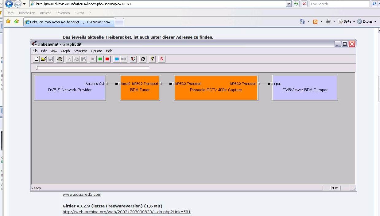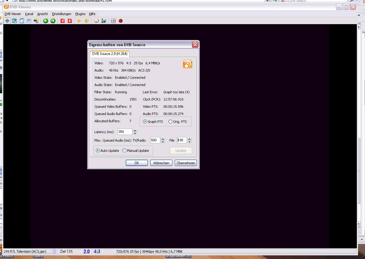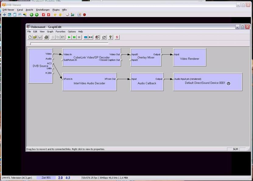 dauiborn66 Posted March 12, 2007 Author Posted March 12, 2007 Hallo der DVBViewer erhält Daten, wenn ich das richtig erkenne sind die Daten sehr fehlerhhaft ich hänge dir mal zwei Bilder an, eins vom DVBViewer mit dem Filter und eins vom GraphEdit, bei dem Programm blicke ich nicht so ganz durch was es mir anzeigt ich habe wieder den Cyberlink eingestellt, das hatte ich gestern bei der ausprobiererei vergessen wieder umzustellen, es hat sich aber nichts geändert Quote