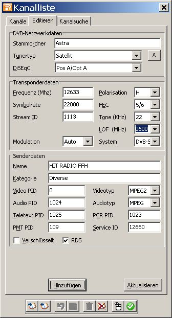 hdv Posted March 15, 2007 Posted March 15, 2007 Hallo, Den kleinen Trick über den Teletext-PID habe ich bereits versucht ohne Erfolg.dann hast du etwas falsch gemacht.Verwendest du den auch den DVBViewer GE? Beim DVBViewer Pro funktioniert das nicht! Ich habe gerade mal die vier Sender HIT RADIO FFH, radio top40, planet radio und harmony.fm durchgeschaltet, auf jedem wird Radiotext gesendet. Es kann also funktionieren. Am besten das hier (klick) beschriebene nocheinmal durchgehen. - Neu: Möglichkeit, den Radiotext der Sender Radio Top40, Hit Radio FFM, Planet Radio und Harmony FM anzuzeigen. Dieser Radiotext wird auf andere Weise als bei den ARD-Sendern übertragen (nicht im Audio- sondern in einem separaten Datenstream). Eine sichere automatische Erkennung ist nicht möglich. Deshalb ist es notwendig, in der Kanalliste Hand anzulegen: 1) Bei RDS muss ein Häkchen gemacht werden. 2) Als Teletext-PID muss die PID des Datenstreams eingetragen werden (blöder Workaround, aber es funktioniert). Die Daten-PIDs für die Sender sind: Radio Top40: 553 Hit Radio FFM: 1025 Planet Radio: 1031 Harmony FM: 1037 Zu beachten ist, dass diese Form des Radiotextes nicht wie bei der ARD in Aufnahmen gespeichert und mit dem RDSExtractor verarbeitet werden kann. Aussehen muß das ganze dann in etwa so. Quote