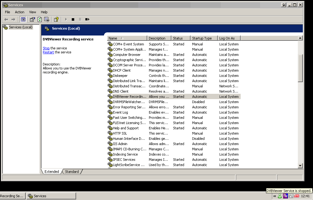 boborg Posted April 8, 2007 Author Posted April 8, 2007 (edited) Yes DVBViewer Recording service is set to startup type Automatic. And as I said it comes up as started inside the service settings window but stopped on the system tray icon as shown in the attachment. It's funny as it worked fine before I did an un/reinstall of DVBViewer. Anyway I'll just keep having the bat file stop/start the service then in the windows startup folder. When I eventually reinstall windows some time in then future it will probably work again. Edited April 8, 2007 by boborg Quote