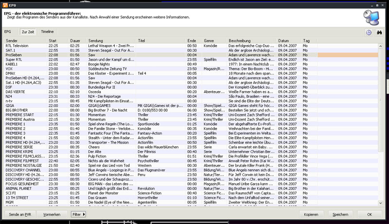 hdv Posted May 7, 2007 Posted May 7, 2007 Hallo, - im EPG/Timeline ist die erste Spalte für die Sendernamen stellenweise zu kleinsoll es den so aussehen? muss ich dann auch ´ne Datei umschreiben, hab leider von so etwas keine Ahnung...wirst du aber müssen. Also: - DVBViewer Pro starten - auf Hilfe -> Info -> Versionsinfo -> den blauen Dateipfad anklicken, danach den DVBViewer Pro unbedingt schließen - jetzt bist du im Konfigurationsordern, in welchem du die Datei setup.xml mit einem Texteditor öffnen mußt (notepad zum Beispiel) - nun mußt du das Wort "LeadingWidth" finden - dort sollte als Zahlenwert 75 hinter stehen, um die Breite wie im obigen Bild zu erreichen trage anstelle der 75 die 150 ein - jetzt die Datei abspeichern und den DVBViewer Pro starten aber die 16:9 Balken haben einen leichten Lilasticprobiere mal das, Balken bei 16:9 sind nicht richtig schwarz! Leider funktioniert mein 2.er H.264 Codec von Mainconcept V2 nicht - Ton ist da, Bild bleibt schwarzprobiere mal die verschiedenen Video Renderer unter Optionen -> DirectX zu finden. bin noch neu und hab sooo viele Fragenauf jeden Fall mehr im Forum lesen, das ist mit großer Wahrscheinlichkeit schoneinmal beantwortet worden. Quote