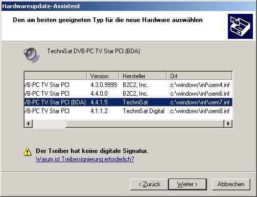 SchauAN Posted April 22, 2007 Author Posted April 22, 2007 Hallo, da bin ich ja schon mal etwas weiter. Nach etlichen weiteren Versuchen hat sich beim Treiberupdate von 4400 auf beta4415 plötzlich eine momentan funktionierende Konstellation ergeben. Die erste Karte läuft weiter als Netzwerkkarte mit 4400 Treiber, die zweite Karte als Audio/Video/Gamecontroller mit BDA Treiber 4415. Mit zwei identischen Treibern klappte es nicht. Spricht etwas gegen diese Mischung? Wie wäre denn der korrekte Installations-Weg für den Mehrkartenbetrieb? Deinstallation der alten Software, Karten aus dem Gerätemanager entfernt, Neustart, Treiberabfrage abgebrochen, 4400 installiert und dann ein Treiberupdate im Gerätemanager von 4400 auf 4415. Bei automatischer Auswahl werden mir die noch vorhandenen Treiber zur Auswahl angeboten. 4415 ausgewählt, aber scheinbar macht Windows doch was es will. Bis jetzt wachen alle ohne Fehler auf! SchauAN support_2_Karten_l_uft.zip Quote