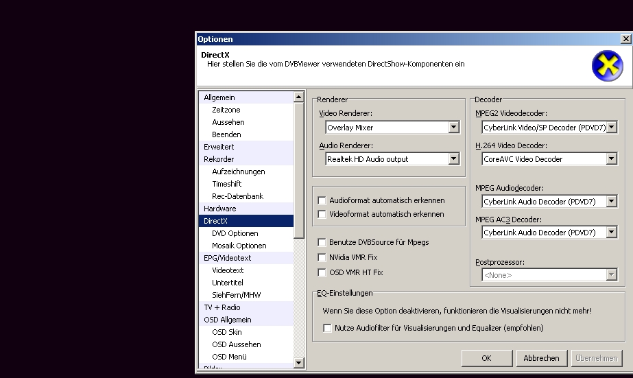 TommyH99 Posted July 14, 2007 Posted July 14, 2007 Hi, da ich jetzt etliche Programme getestet habe und keines mir wirklich das passende Bild für HD liefert und artifakte bzw. gezoomt und verschoben anzeigt bzw. auch abstützt mit bluescreen. Hab ich mir endlich das Programm zugelegt, hoffe es verspricht wirklich das wie alle berichten Wie schon geschrieben ich hab folgende Karte SkyStar HD aktuelle Treiber XP SP2 X2 3800+ 6150NVIDIA 256MB Ram (DVI/VGA) 2048MB Ram und wird ausgeliefert (Zur Zeit nur per VGA(!) auf meinen LCD) Die normalen Sender (PAL) funktionieren super mit jedem Programm, aber diesen Zeitpunkt wo ich auf HD Sender (free oder pay) umschalte reagieren die Programme unterschiedlich Artifakte(grün) extrem gezoomt verzogen komische Balken Hab schon verschiede Codec getestet und auch Grafikkarten Treiber getestet, aber es nutzt alles nichts Das lustige ist ja, wenn ich zb. Anixe HD aufnehme und mir es dann angucke passt alles nur die wiedergabe vom TV Tool is das Problem, aufnahme von Premiere HD funkt, aber das abspielen nicht, evtl. verschlüsselt?! Könnten die jenigen die folgende SAT Karte in verwendung haben, mir deren Einstellungen mitteilen, weil langsam verzweifel ich sehr und überlege mir wirklich auf einen HD Receiver umzusteigen Vl. hat auch jemand einen Tipp lg tommy Quote