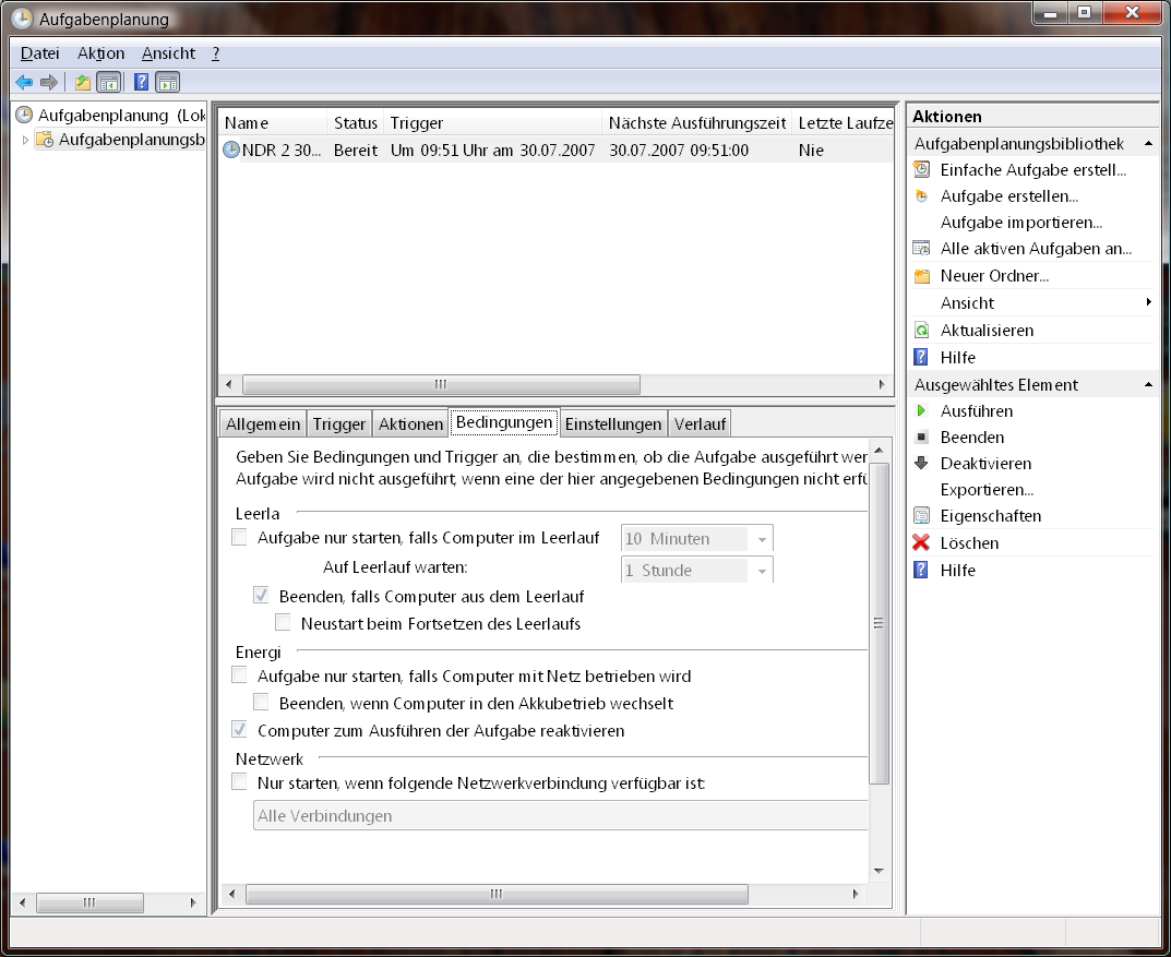 Hartwig Posted July 28, 2007 Posted July 28, 2007 Keine Ahnung, warum das anders aussieht. Wahrscheinlich weil du ne andere Vista Version hast wie ich. Wenn ich das System mit laufenden DVBViewer in den Ruhemodus versetzeInteressant, aber auch merkwürdig. Das ganze geht übrigens, weil Vista es nicht mehr zuläßt, dass ein Programm den Ruhemodus verhindert. Nachteil ist, dass der Filtergraph das nicht mitmacht und der DVBViewer anscheinend die Karte nicht neu initialisiert, obwohl die Verbindung abgebrochen ist. Daher die 4 kB Datei. Das ist halt der Nachteil an Vista. Kannst du denn manuell in der Aufgabenplanung Tasks erstellen, die den PC aufwecken? lege doch einfach mal einen an, der z.B. Notepad startet. Wichtig ist, daß der Haken bei Rechner zum Ausführen des Tasks reaktivieren gesetzt ist. Quote