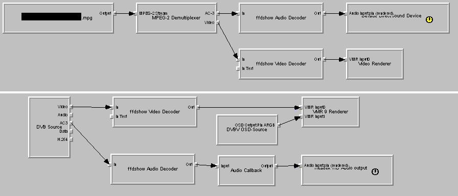 Warp10 Posted August 12, 2007 Author Posted August 12, 2007 Ich habe mir jetzt den Graph mit Graphedit angeschaut. Zunächst habe ich direkt die .mpg Datei mit Graphedit abgespielt, die resultierende Filterkette ist im oberen Teil der Bildes zu sehen. Während dem Abspielen mit Graphedit konnte ich problemlos im Video vor- und zurückspringen (mit dem Slider in Graphedit). Ton und Bild kommen dann sofort wieder. Dann habe ich das Video in DVBViewer geladen und mit Graphedit in die Filterkette mit "Connect to Remote Graph" eingeklinkt. Der entsprechende Graph ist im unteren Teil des Bildes zu sehen. Testweise habe ich den DVBSource-Filter in DVBViewer deaktiviert, die Verzögerung beim Vorspulen blieb aber bestehen. Mit aktiviertem DVBSource-Filter ist mir aufgefallen, dass beim Vorspulen unter "Last Error" des DVBSource Eigenschaften Fensters zunächst steht "Graph to late" und danach "Buffer Overflow". Manchmal erscheint aber auch sofort "Buffer Overflow". Ich verstehe nicht, wieso ich mit Graphedit ohne Probleme im Video umherspringen kann aber mit DVBViewer bei nahezu identischer Filterkette nicht. Vielen Dank schonmal, Thorsten Quote