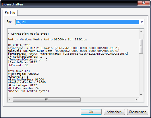Griga Posted January 21, 2009 Posted January 21, 2009 Die Decoder stehen in der Kategorie DMO Audio Decoders (DMO = DirectX Media Object). Das sind keine DirectShowfilter. Sie werden über einen DMO-Wrapper-Filter in den Filtergraph eingebunden. ein großer Fortschritt ist zu verzeichnen. Wenn das Audio Postprocessor Plugin auf AC3 Filter steht, klappt die Wiedergabe aller sechs Kanäle Ok, dann scheint das Plugin zu funktionieren. Es ist erst mal für Testzwecke gedacht. Später möchte ich die Aktivierung von Mehrkanal-WMA in das Postprocessor Plugin integrieren, mit eigenem Menüpunkt, so dass man sie an- und abschalten kann. Quote