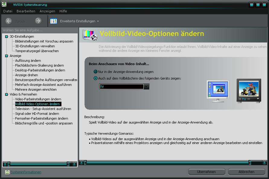 Norman99 Posted August 25, 2007 Posted August 25, 2007 Hallo, Ich schreibe mal vorsichtig ins Anfängerforum, würde mich aber nicht mehr so als Anfänger bezeichnen. Wenn ich ganz normal meine Geforce 6600 auf CLONE oder auf DUALVIEW einstelle und den FERNSEHER als primärgerät auswhäle funktioniert alles einwandfrei! Nun habe ich lange ProgDVB genutzt und die Systemsteuerung von Nvidia so geändert das wenn ich irgendein VIDEO Abspiel Programm starte - dieses sofort in Fullscreen auf dem Fernseher erscheint. Dort wurden dann alle OSD Anzeigen auch mich angezeigt. Mein Problem ist nun das DVBViewer dieses nicht mit anzeigt, egal in welcher VIDEO Render Funktion ich mich befinde. Nun muss ich jedesmal die Grafikeinstellungen umstellen und habe auf meinem normalen Flachbildschirm eine viel zu große Auflösung. Danke schon mal für eure Hilfe. Quote