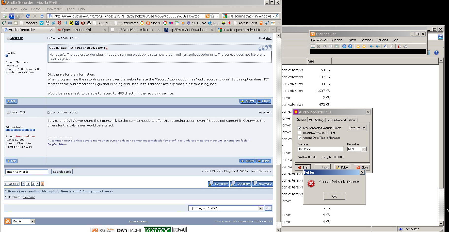 Griga Posted September 5, 2009 Author Posted September 5, 2009 Forgot to add the list of audio codecs found in my system. Useless. If you want to provide information: http://www.DVBViewer.info/forum/index.php?showtopic=2210 Most likely the audio decoder selected in DVBViewer is not configured for 16 bit PCM output, but for SPDIF passthrough or such, which means, it doesn't decode. The Audio Recorder Plugin searches the filter graph for a DirectShow Filter providing an output pin that delivers 16 bit PCM audio (required as input for the lame and ogg vorbis encoder) and an input pin (if present) that receives a different format. If it can't find such a filter, you'll get an error message. Quote