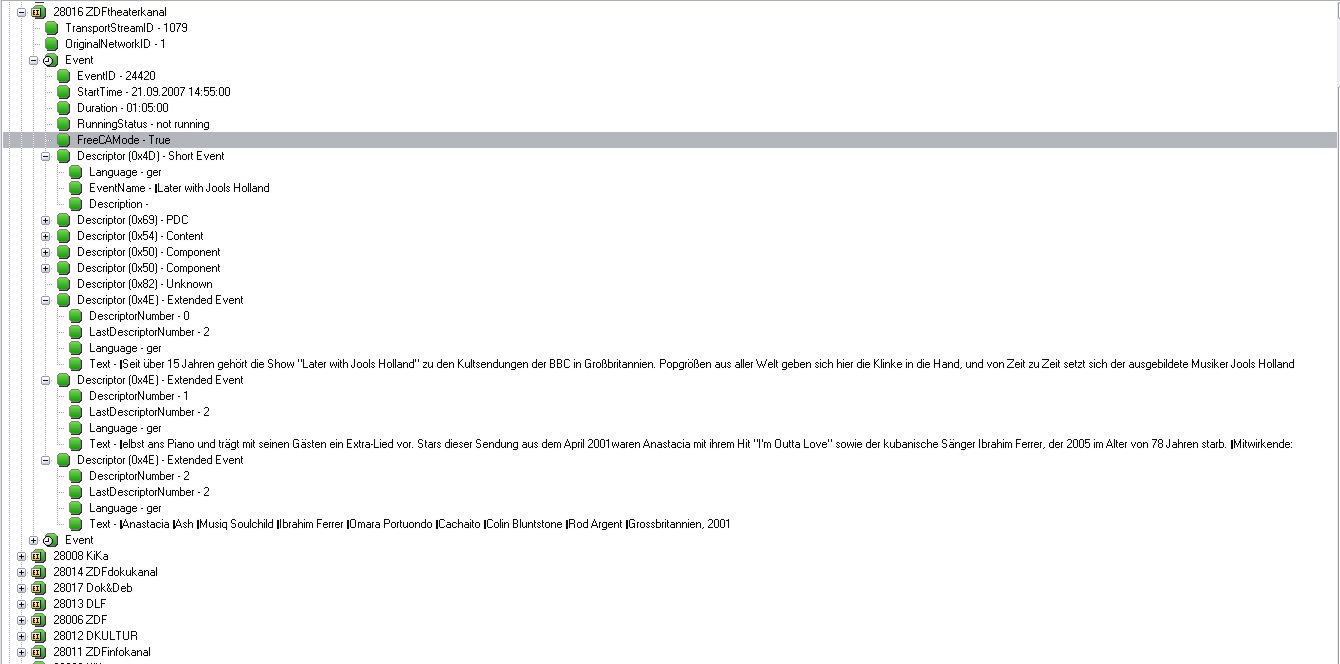 JMS Posted September 21, 2007 Posted September 21, 2007 (edited) Falls Du Beispielcode suchst, kannst Du Dir ja auch mal mein DVB.NET anschauen, da gibt es einen Teil, der sich nur mit der Analyse von SI Tabellen und allen voran dem EPG auseinander setzt. Jochen <Zusatz>Ups, vergessen: zum Umpaketieren von TS in SI Tabellen gibt es auch was in einem anderen Bereich von DVB.NET.</Zusatz> <Zusatz>Noch einer: der EPG Reader ist ein Tool in DVB.NET, das unter anderem eine TS Datei liest und das EPG extrahiert. Da kann man sehr schön sehen, wie die einzelnen Klassen zusammenspielen, um die Events zu liefern.</Zusatz> Edited September 21, 2007 by JMS Quote