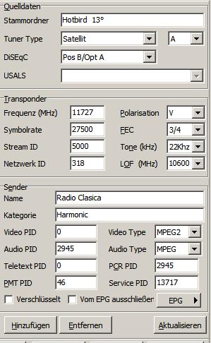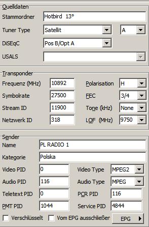SamYucca Posted February 23, 2009 Posted February 23, 2009 (edited) Da ich nicht genau weiß, wo ich die "Senderkennung" finde, füge ich Screenshots des Senderlisten-Editors bei, und zwar für Radio Clasica Bei CYFRA+ PR2 (PR2) ist die Sache etwas komplizierter, da auf einer Frequenz (10892 H Hotbird) 5 verschiedene Radioprogramme ausgestrahlt werden. Der Sendername ist "PL RADIO 1", wenn man auf die Audio-PID 116 wechselt, erscheint der Name CYFRA+ PR2 (PR2). Wenn andere Angaben benötigt werden, bitte Bescheid geben. Edited February 23, 2009 by SamYucca Quote
