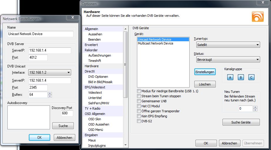 ICeY Posted October 6, 2007 Posted October 6, 2007 Hi! Hab mir heute DVBViewer zugelegt, da vor kurzer Zeit mein Fernseher kaputt gegangen ist und ich mir mangels Geld keinen neuen kaufen kann. Jetzt möchte ich via Netzwerk auf meinen Laptop streamen, hab dazu folgende Anleitung verwendet: http://www.steffen-klausing.de/content4/fa...&artlang=de Auf dem Server ist funktioniert der Empfang via TV Karte ohne Probleme. Konfiguration Laptop: IP: 192.168.1.2 Konfiguration Server: IP: 192.168.1.4 Leider habe ich auf meinem Laptop weder eine Kanalliste noch verbindet der Laptop sich zum Server. Muss ich nach Kanälen suchen? Vielleicht kann mir ja jemand helfen! Quote