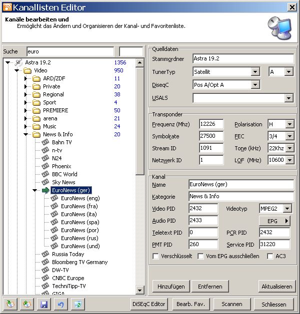 hdv Posted November 18, 2007 Posted November 18, 2007 Hallo, hier kann ich die Probleme mit Euronews etc. nicht bestätigen. Wie sieht der DirectShow Graph den aus? Nutze bitte mal GraphEdit, und poste den Filtergraphen als Screenshot. Ansonsten, wenn nicht gebraucht, könntest du auch mal alle Subkanäle entfernen, in dem du im Kanal Editor diese löscht, sodas nur der Haupteintrag übrig bleibt. Eigentlich reicht ja auch die eigene Sprache. Die anderen Subkanale sollten allerdings mithilfe der Auto Update Funktion wieder hinzugefügt werden. Quote