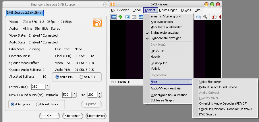 bobeba Posted November 23, 2007 Author Posted November 23, 2007 da ich ein newbie bin hoffe ich das richtige gemacht zu haben. 1. hab ich mit hilfe von eingabeaufforderung "DVBViewer.exe -debug" gestartet dann support.zip erstellt. hoffe das war richtig. hat nicht lange gedauert bis DVBViewer abgestürzt ist ca. 20 sek. nach den ersten ca. 10 sek ist das Bild eingefrohren und sound war zwischen den ca. 10 und 20 sek verzerrt hörbar aber nach ca. 20 sek. ganz weg. Wenn ich dann zu einem anderen Sender aus Turksat gewechselt habe ging alles wieder ganz normal ohne DVBViewer neustarten zu müssen. 2. "Diskontinuität " keine ahnung was das ist aber ich habe dir ein Screenshout gemacht ich hoffe das hilft dir weiter. danke... support_mit_debug.zip Quote