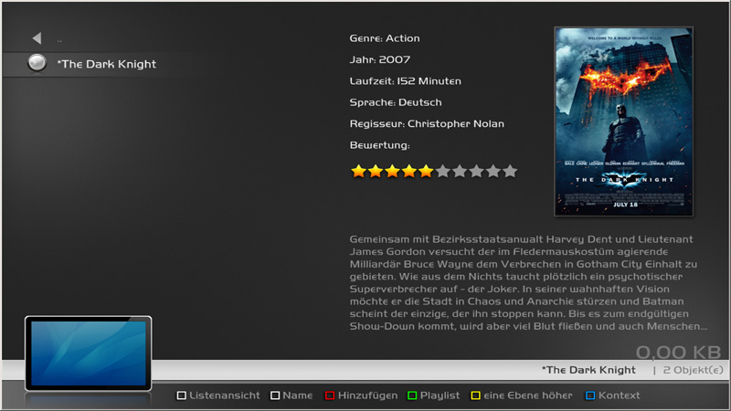 xice Posted December 7, 2007 Posted December 7, 2007 (edited) concinnity v2 Details zum Skin : Auflösung : 1680x1050 (16:10) Wetter-Icon : 196x196 Font : HandelGotDLig ... ist bei vielen Free-Fonts Seiten zu finden. Kann aber auch ohne diesen Font betrieben werden! Da ich nun etwas Zeit habe, hab ich den Skin etwas optimiert bzw. angepasst. Es handelt sich hier noch nicht um die endgültige Final-Version. Es müssen noch einige Optimierungen vorgenohmen werden. Dabei könnt ihr natürlich helfen, in dem Bugs oder Verbesserungsvoschläge gemacht werden. mfg. XICE UPDATE v2.01 - Audio-Logos komplett - Diverse Buttons hinzugefügt - Duration überarbeitet - EPG überarbeitet - Wetter-Info überarbeitet - Farben angepasst UPDATE v2.02 - Weiteres bug fixing - Concinnity Plugin (sehr frühe Beta) Mit dem Plugin ist es möglich weitere Details in der List-Ansicht darzustellen (Siehe Bild) Wer das Plugin nutzen möchte (muss man aber nicht), sollte folgende Dateien haben! Folder.jpg oder eine Bilddatei von einem Video-File und außerdem eine Infodatei. Beispiel... Der Ordner [300] beinhaltet eine Folder.jpg oder 300.jpg und 300.txt Die Infodatei 300.txt sieht so aus: [Info] Year=2006 Director=Zack Snyder Stars=8 Runtime=117 Minuten Language=Deutsch Genre=Action info=Im 5. Jahrhundert vor Christus sieht sich Sparta durch die gewaltige Armee des Gott-Königs Xerxes bedroht. Leonidas, König von Sparta, stellt sich der gegnerischen Armee mit 300 Elite-Soldaten. Zack Snyder präsentiert eine Geschichte von Frank Miller (“Sin City”), die neue Maßstäbe in der visuellen Gestaltung setzt. UPDATE v2.03 - Timeshift Symbol im MiniEPG an/aus (plugin erforderlich) - Auslesen von Informationen einer Aufnahme. Die miterzeugte Dateiinfo wird benötigt (plugin erforderlich) - Weitere Anpassungen concinnity-v203-P.rar Skin mit Erweiterungen. Den dazugehörigen Plugin mit runterladen und in das Plugin-Verzeichnis des DVBViewer kopieren. concinnity-v203.rar Standard-Skin ohne Erweiterung. Plugin wird nicht benötigt ! Der Skin ist momentan für die deutsche Sprache optimiert. Mit anderen Sprachen kann es zu Textüberschneidungen kommen ! concinnity_v203.rar concinnity_v203_P.rar concinnity_Plugin.rar Edited September 8, 2009 by xice Quote