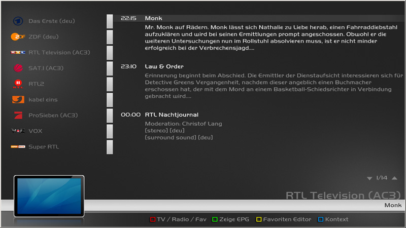 xice Posted December 10, 2007 Author Posted December 10, 2007 Fantastischer Skin ! Respekt ! Meinst du mit "Icons" bei deiner Liste der künftigen Verbesserungen die Senderlogos? Wäre schön, wenn die beim Kurzinfoblock eines Kanals angezeigt würden. Nein, das habe ich nicht in Planung. Da kümmert sich bereits MarkusK drum. Quote