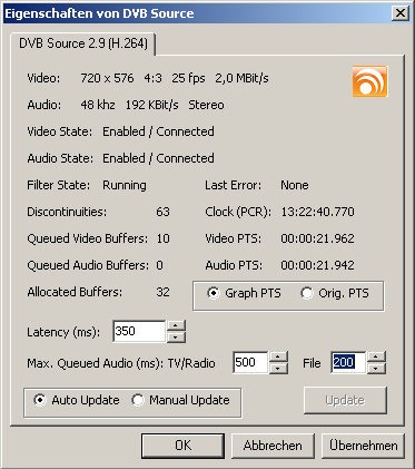 Moses Posted December 25, 2007 Posted December 25, 2007 Discontinuties 63 ist schonmal ein schlechtes Zeichen. Geht das hoch? Das ist entweder ein Empfangsproblem oder irgendwas im Treiber... der Stream ist schon kaputt, bevor der DVBViewer ihn bekommt. Quote