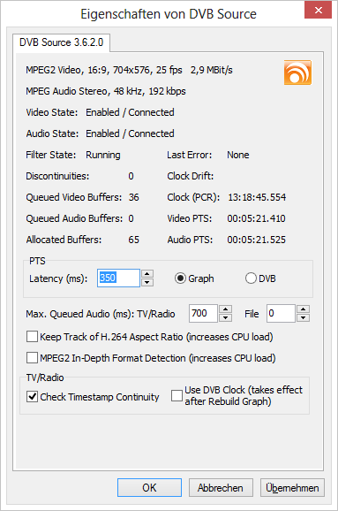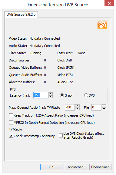 Griga Posted September 24, 2013 Posted September 24, 2013 Please check the DVBViewer Filter's property page: http://www.DVBViewer.com/griga/DVBSource%20E/DVBSource.html What do you see? Is data arriving? Without discontinuities? If yes it is a decoder problem. If not it is a reception problem or caused by wrong channel data. Quote