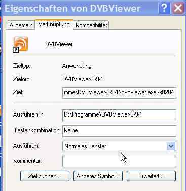 hdv Posted December 29, 2007 Posted December 29, 2007 Hallo, copy paste aus der Verknüpfung: C:\Programme\DVBViewer\DVBViewer.exe -x2110ja und? Wo sind die Anführungszeichen!Das Kommando muß auf jeden Fall außerhalb der Anführungszeichen stehen! Du mußt in das Feld Ziel das eintragen: "C:\Programme\DVBViewer\DVBViewer.exe" -x2110 Quote