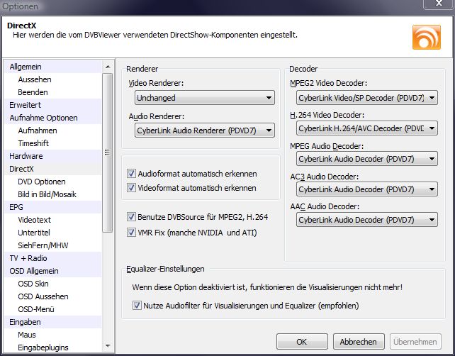 sunnyboy93 Posted December 29, 2007 Posted December 29, 2007 Hallo, nun möchte ich hier meinen ersten Beitrag verfassen... Habe den DVBViewer nun schon ein paar Wochen und bin auch zufrieden damit. Nun gibt es aber ein Problem, dass mich immer wieder auf's neue stört: Wenn ich den DVBViewer starte kommt kein Bild & Ton. Wenn ich nun den Sender wechsle, höre ich den Ton aber sehe kein Bild. Um nun Bild & Ton mit dem Video-Renderer "Unchanged" zu sehen, muss ich immer zuerst unter "Einstellungen/Optionen/DirectX/Renderer/Video Renderer" von Unchanged auf Overlay Mixer (dann Bild) und danach wieder auf Unchanged (da ich bei Unchanged ein besseres Bild als bei Overlay Mixer habe) stellen. Das nervt mich ziemlich und ist schon seit der Erst-Installation von DVDViewer so, da half auch das Update auf 3.9.1.0 nichts... Wisst ihr was ich machen muss, damit der DVBViewer mit richtigem Bild & Ton startet? (Im Anhang ist noch ein Screenshot von "Optionen/DirectX") Ich würde mich auf eine Antwort freuen. Grüße, Tim. Meine zusätzlichen Daten: TV-Karte: TechniSat SkyStar 2 TV PCI (Software 4.4.1) Grafik-Karte: NVIDIA GeForce 8800 GT (ForceWare 169.02) Main-Board: DELL 0CT017 (Chipsatz P965) support.zip Quote