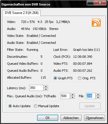 Tjod Posted January 9, 2008 Posted January 9, 2008 Hin und wieder kommt es schon vor das ein Beitrag vergessen wird. Wenn mach 2-3 Tagen keiner geantwortet hat, schadet es nicht mal im gleichen Topic nachzufragen (solche nachfragen aber frühestens nach 24 Stunden). So zum Problem Setze mal die Werte im DVB Source Filter auf die Standard werte zurück. Max. Queued Audio (TV/Radio): 500 ms Max. Queued Audio (File): 200 ms Latency: 350 ms Quote