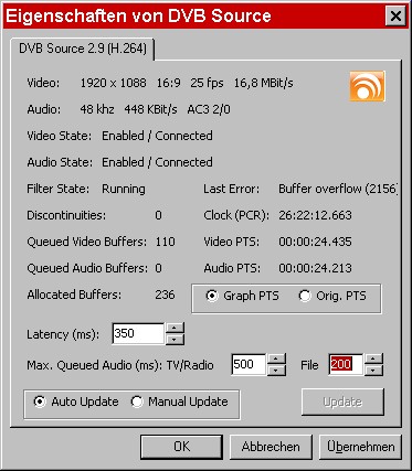 claus_973 Posted January 6, 2008 Posted January 6, 2008 Hallo, bisher hatte ich bei HD-Sendern eine ruckelnde Wiedergabe. Deswegen habe ich PowerDVD 7.3 installiert, um die HD-Fähigkeiten meiner Grafikkarte "ATI Radeon HD 2600 PRO" nutzen zu können. Hier kommt es allerdings bei allen HD-Sendern zu Bildfehlern (siehe Bild_1 im Anhang, man hat den Eindruck von zerfließenden Farben). Im Fenster "DVB Source" erscheint bei "Last Error": "Buffer overflow" (siehe Bild_2 im Anhang). Speziell bei Anixe HD friert der Rechner nach einigen Minuten ein, dann erscheint ein BlueScreen (siehe Bild_3 im Anhang). Manchmal funktioniert die Wiedergabe nach anfänglichen Bildfehlern nach einigen Minuten plötzlich. Die Wiedergabe ist flüssig und der Task-Manager zeigt mir eine CPU-Auslastung von unter 10%. Vor Installation von PowerDVD 7.3 war es mindestens 50%. Bild_4 im Anhang zeigt meine DirectX-Einstellungen im DVBViewer. Wie empfohlen habe ich für Audio und Video den CyberLink Decoder und als Video Renderer VMR9 oder Overlay Mixer gewählt. Sind das die richtigen Einstellungen? Zusammenfassend gesagt funktioniert die HD-Wiedergabe nicht sehr zuverlässig (mehrere BlueScreens am Tag), während SD-TV-Sender immer fehlerfrei wiedergegeben werden. Da auch stundenlanges Experimentieren mit den Einstellungen nicht geholfen hat, bitte ich um Hilfe. Außer der support.zip im Anhang hier noch einige Details: - Mainboard Intel 945P - TV-Karte: TT-budget S2-3200(BDA) - BDA-Data.exe Version 1.3.0.0 (27.04.2007) support.zip Quote