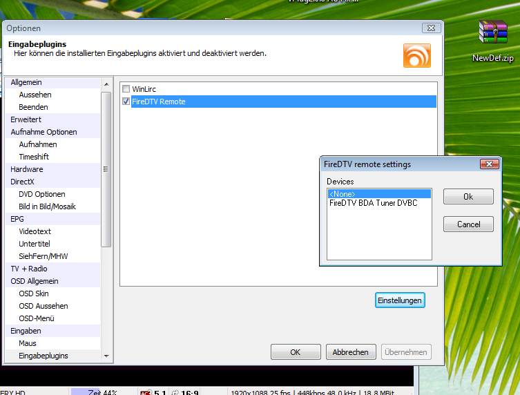 Partyhunter Posted January 12, 2008 Author Posted January 12, 2008 (edited) SO jetzt habe ich das FireDTV Remote PLugins unter Optionen > eingaben aktiviert, jedoch funktioniert es immer noch nicht wenn ich die fernbedienung anlernen will und auf einer bestimme sache klicke und auf dne knopf lernen. Dann drücke ich den entsprechenden knopf auf der fernbedienung aber es verändert sich nichts es passiert einfach nichts ;( ICh habe nochmal ein Bild angehäng was soll ich auswählen non oder firedtv bda Edited January 12, 2008 by Partyhunter Quote
