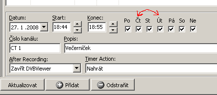 IRa Posted January 28, 2008 Posted January 28, 2008 in recording window Tuesday and Thursday is switched. It should be Po Ut St Ct Pa So Ne (see pic)You can correct it by yourself, in czech.lng (in DVBViewer/language folder) you can find section [frmRecorder] and under it lblTh.Caption=yy and lblTu.Caption=zz, just edit them with Notepad and start DVBViewer again. Quote