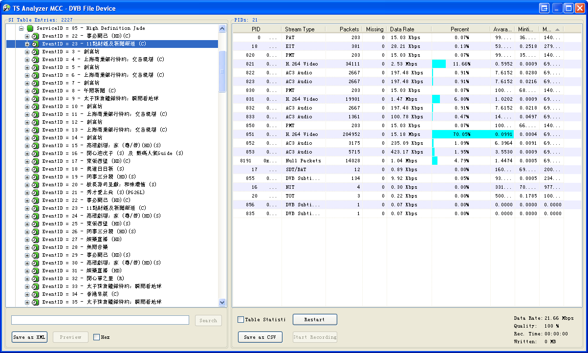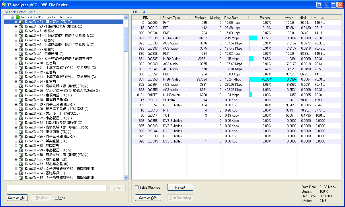 sickno Posted March 16, 2008 Posted March 16, 2008 (edited) I know the third and fourth line is the data transmitted in the epg stream. I realized that this is obviously wrong, because the content was not displayed at all (even for my understanding). The attached text file is for example a text entry in the eit. The first byte is always 0x11 and points you to the information which type of encoding the text is. In this case ISO/IEC 10646-1 Basic Multilingual Plane. The most important thing i need to know is if the screenshot of transedit shows correct information (the chinese text in the screenshot - on the last page). The following screenshot has been taken with mingliu and BIG5 as output: Christian Christian, The jpg file output looks OK, but the .txt file is NOT correct. Please have a look at the image attached: (The left bottom part of the image shows the expected output, whereas the bottom right shows what is actually showing in my screen) For the jpg file, all of them are valid Traditional Chinese characters and the translation of the image to English text is as follows: [-] ServiceID = 85 - High Definition Jade [+] EventID = 22 - Info Link (HD)© [+] EventID = 23 - Financial News and News at 11 © [+] EventID = 3 - Money Smart [+] EventID = 4 - Shanghai Comm. Bank Presents: Inside the Stock Exchange © [+] EventID = 5 - Money Smart [+] EventID = 6 - Shanghai Comm. Bank Presents: Inside the Stock Exchange © [+] EventID = 7 - Money Smart [+] EventID = 8 - News at Noon © [+] EventID = 9 - Prince Jewellery & Watch Presents: EARTH LIVE [+] EventID = 10 - Money Smart [+] EventID = 11 - Shanghai Comm. Bank Presents: Inside the Stock Exchange © [+] EventID = 12 - Money Smart [+] EventID = 13 - Shanghai Comm. Bank Presents: Inside the Stock Exchange © [+] EventID = 14 - Money Smart [+] EventID = 15 - High Definition Drama: Home (Cantonese/Mandarin)(HD)(S) [+] EventID = 16 - Happy Chinese New Year of "Earth" "Mouse" (S) and Digital Buzz Guide (S) [+] EventID = 17 - Scoop (HD)© [+] EventID = 18 - Olympics Daily (S) [+] EventID = 19 - Best Selling Secrets (HD)(S) [+] EventID = 20 - Itacho Sushi Presents: Wasabi Mon Amour (S) [+] EventID = 21 - The Gentle Crackdown II (S)(PG26L) [+] EventID = 22 - Info Link (HD)© [+] EventID = 23 - Financial News and News at 11 © [+] EventID = 24 - High Definition Drama: Home (Cantonese/Mandarin)(HD)(S) [+] EventID = 25 - Scoop (HD)© [+] EventID = 26 - Best Selling Secrets (HD)(S) [+] EventID = 27 - E-Buzz (HD) [+] EventID = 28 - Global Rhythm [+] EventID = 29 - Info Link (HD)© [+] EventID = 30 - High Definition Drama: Home (Cantonese/Mandarin)(HD)(S) [+] EventID = 31 - E-Buzz (HD) [+] EventID = 32 - Mind Our Own Business ® [+] EventID = 33 - Prince Jewellery & Watch Presents: EARTH LIVE [+] EventID = 34 - Good Morning Hong Kong © [+] EventID = 35 - Prince Jewellery & Watch Presents: EARTH LIVE Edited March 16, 2008 by sickno Quote