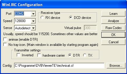 DerFranke Posted March 2, 2008 Posted March 2, 2008 also ich habe mir ne SkyStar 2 TV karte gekauft und eingebaut... funktioniert einwandfrei nur die Fernbedienung funktioniert nicht. also habe den IR empfänger angeschlossen. AP Launcher geöffnet *DVBViewer.exe eingestellt*>> ts_winlirc.exe geöffnet und dann kommt "Winlirc failed to initialize. Would you like to change the configuration and try it again?" Hab ich des da alles richtig eingestellt?? oder wo könnte des sonst noch liegen?? thx im Vorraus Wenn du die SkyStar 2 TV Karte hast, ist doch ein USB Adapter für die Fernbedienung dabei, dann brauchst du doch Winlirc gar nicht... Quote