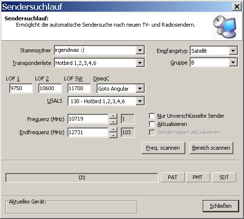 Matty Posted May 18, 2008 Posted May 18, 2008 geht bei mir super einfach mit DVBViewer, einfacher wie bei jedem anderen Programm, einfach rechte Maustaste -> Channel scan anwählen, Transponder-List des gewünschten Satelliten anwählen, unter DiseqC "Use Positioner" anwählen, und dann unter USALS rotorspezische Position eintragen, bei mir Position 1 für Hotbird, Position 2 für Astra ... und dann auf Scan Range klicken der scan startet sofort, obwohl der Rototor noch ein bisschen braucht bis er auf dem Satellit ist, deshalb eventuell nach dem scan nochmal den scan machen ich habe einige Sat-Programme ausprobiert, DVBViewer ist echt super, absolut die geringe Registierungsbebühr wert!!!!!! Quote