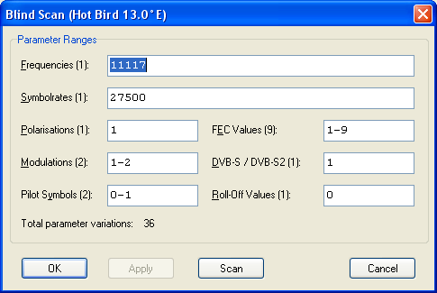 Griga Posted May 21, 2008 Posted May 21, 2008 You can find the correct DVB-S2 parameters for your FireDTV S2 and a particular DVB-S2 transponder by performing a blind scan with TransEdit (see members area) over just one frequency, provided the frequency, symbolrate and polarisation are known. Your input in the Blind Scan Window should look like this (just an example for Hotbird 11117 H, SR 27500 - adjust it to your transponders in question): Quote