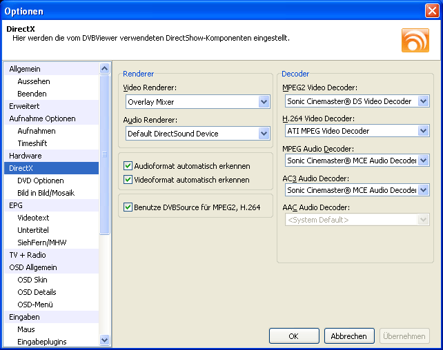 kh-secure Posted June 6, 2008 Author Posted June 6, 2008 Jetzt funktioniert endlich wieder alles einwandfrei Falls es Jemanden interessiert: Habe das Problem folgendermaßen behoben (zwar nicht die feine Art, aber für mich die schnellste): Alles (auch die TE, Treiber etc.) deinstalliert, und dann alles neu installiert: Treiber für Technisat SkyStar 2 PCI (Vers. 4.4.1.0) DVBViewer TE (aktuellste Version) DVBViewer Pro (Vers. 3.9.4.0) DVB Task-Scheduler (Vers. 2.1.2.3) Einstellungen DirectX (siehe Screenshot) Aber warum eine Mauszeigerbewegung zu solch einem Fehler führt, würde mich trotzdem interessieren. Habe zwar Windoofs drauf, aber eigentlich kenne ich es nur als Scherz vonwegen "Sie haben die Position des Mauszeigers bewegt. bitte starten Sie den PC neu". Quote