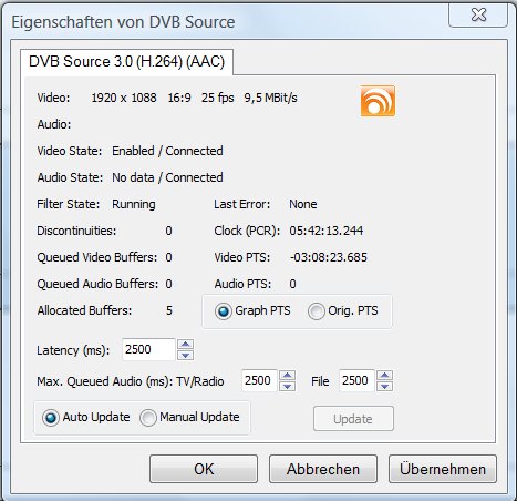 -oMLeTTe- Posted June 12, 2008 Posted June 12, 2008 Hallo, Ich bekomme kein Bild auf ORF HD. Die Entschlüsselung läuft anscheinend ohne Probleme, es gibt zumindest keine Fehlermeldung im Info-Fenster. Unter View-Filters-DVBSource steht jedoch folgendes Video State: Enabled / Connected Audio State: NO DATA / Connected wie auch auf dem Bild zu sehen. Alle anderen Sender (HD und Normale) funktionieren einwandfrei. Quote