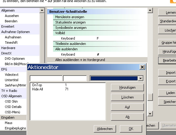hdv Posted July 1, 2008 Posted July 1, 2008 Hallo, klicke die Zeile mit dem # an. Danach auf Löschen klicken, somit wird die Taste für andere Funktionen freigegeben. als Schaltfläche in der Menüleiste ablegen könntedas funktioniert nicht.Eine Taste hat man ja auch eigentlich viel schneller gedrückt, als wenn man eine kleine Schaltfläche anklicken muß. Mit Kommandoparametern könntest du eine Schaltfläche/Verknüpfung in der Taskleiste erstellen. -> http://wiki.DVBViewer.info/index.php/Kommandoparameter Das wären dann die Parameter -x1 und -x71 Quote