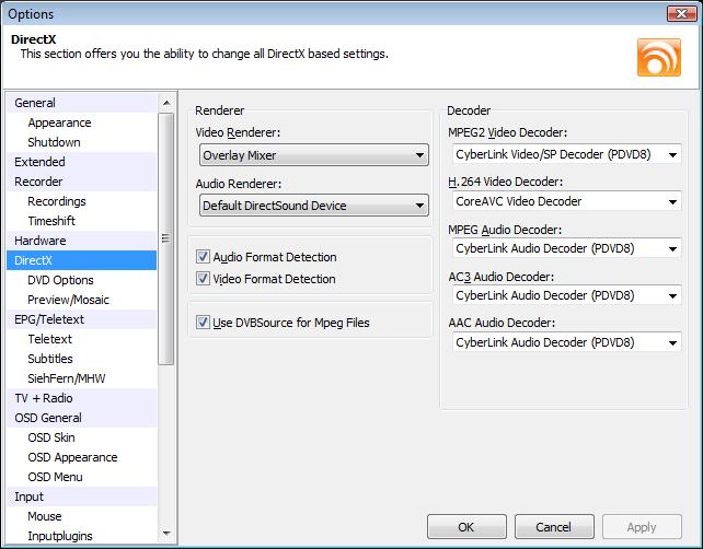 fxv300 Posted June 30, 2008 Posted June 30, 2008 I have a similar problem. I installed PowerDVD8, then I though "hey, now I can use the Cyberlink Audio Decoder with Vista instead of AC3filter".I selected in Options-Directx the cyberlink audio decoder. But still it used AC3filter. Then I uninstalled AC3filter. Now I have no sound, but an error message coming up after starting DVBViewer "Could not render audio pin". I reinstalled AC3filter, to no avail. However, if I switch between AC3 and non AC3 stations, I suddenly get sound, and it stays then until next time the graph is rebuilt. Funny thing: I can see a DirectShow Graph number for BDA and playback, however when I connect to it with Graphedit it would only show an empty window! Any thoughts? Not sure where to place this. I get 2 windows open up when I launch DVBViewer. I am running 3.9.4 on Vista 32. see upload I also asked about how to add a Terrestial USB device to be detected by DVBViewer. Quote