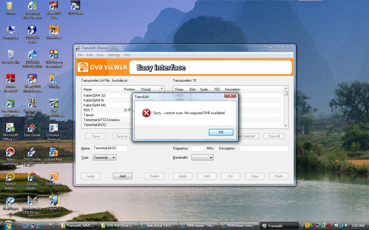 Simonlee Posted September 3, 2008 Author Posted September 3, 2008 Way trying with TransEdit MMC if you have DVBViewer Pro already?Every time you install new Driver go to DVBViewer > Options > Hardware > search device. On the Twinhan page (here) is only one BDA Driver for the 7047. If this do not work with Vista, i think you can only ask Twinhan. After a thousand time of uninstall & reinstall everything, I finally reach a stage that I can watch free to air TV. I don't know what makes that changes because nothing new has been actually installed. But now the big problem is the extremely low % reading (1% - 3% only) shown in the bottom section of the program as shown in pic3.jpg. When recording subtitle, that created an error .ts file that subtitle cannot be shown in other software. Another rare situation is that I do have a REALTEK 2831U_BDA filter installed. But TransEdit cannot see it. It always shows no required dvb available. Is there any solution? especially anything I can do to correct the extremely low % reading? Thanks. support.zip Quote