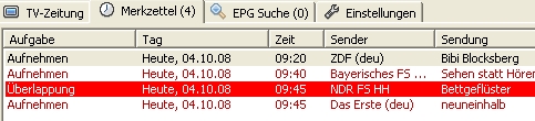 Rayman Posted October 4, 2008 Posted October 4, 2008 Hallo allerseits, nur zur Erklärung: EPGplus selbst macht diesbezüglich garnichts, es gibt nur die Informationen wieder, die der DVBViewer übermittelt. Wenn man die Recorder-Programmierung des DVBViewer öffnet, müssten dort die selben Konflikte etc. zu sehen sein. Falls es Schwierigkeiten mit Überlappungen, mehreren SAT-Karten etc gibt, müssen wir gucken was der DVBViewer anstellt :-) Viele Grüße, Stefan. Quote